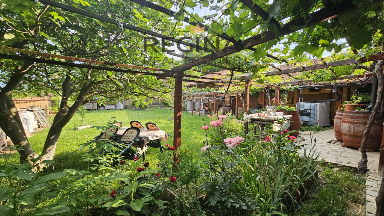 Тази част от двора е истинско бижу – оформена с внимание към детайла и усещането за автентична винена култура – комбинация от жива природа, ръчно изработени дървени елементи и възможности за винени дегустации и отдих на открито. Теренът е облагороден с тревна площ, овощни дръвчета и лозови насаждения. Има сенчеста зона с прекрасна стара смокиня, под която летните вечери се превръщат в идилия, потопена в прохлада. А лозовата асма над каменната пътека носи носталгията и очарованието на отдавна отминалите времена. Комбинацията между добре поддържана зеленина, традиционна архитектура и винени мотиви прави тази част от имота не просто красива градина, а истинско изживяване, което остава в съзнанието на всеки посетител.
