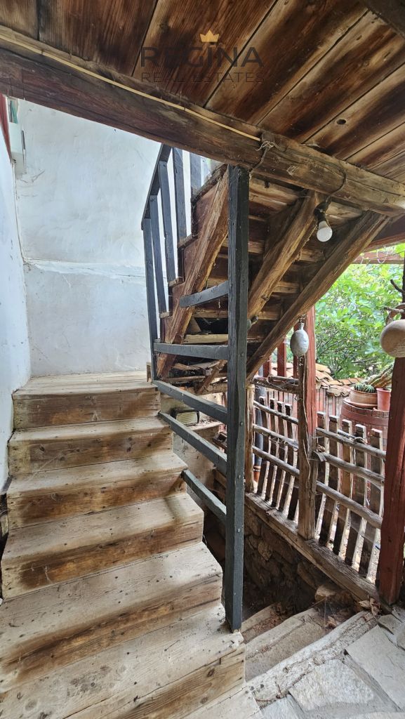 Къщата има външно дървено стълбище и красива просторна тераса, които се вписват идеално в атмосферата на селски уют и традиционна архитектура.