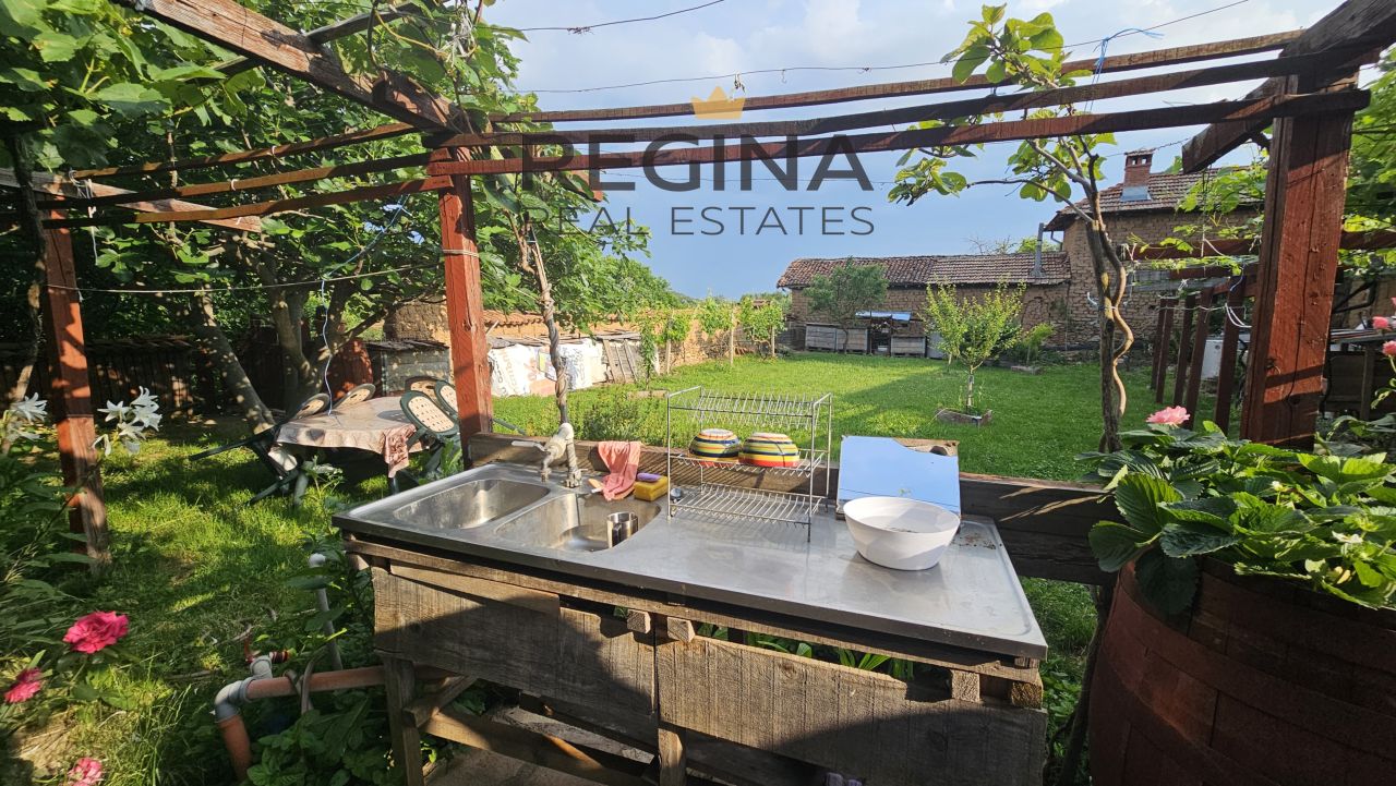 Дворното място е с площ 1142 кв. м, разположено е на две тераси и е красиво озеленено. Първото ниво се намира непосредстено пред къщата. В него са разположени стопанска постройка с площ 36 кв. м., използвана за склад за градински инструменти и навес с площ от 70 кв. м. тип «лятна кухня». Той се състои от едно голямо помещение, обособено като зала за събирания, потопена в автентични вещи от миналия век като там е позиционирана истинска рядка находка - казан за варене на розово масло. В съседство има всекидневна с кухня, разполагаща с традиционна пещ за печене на агнета и санитарно помещение с хидромасажна душ кабина. Помещенията са с подменена дограма, има поставена вата на стените и тавана.